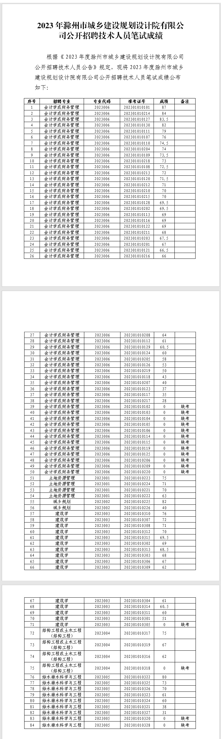 2023年滁州市城鄉(xiāng)建設(shè)規(guī)劃設(shè)計(jì)院有限公司公開招聘技術(shù)人員筆試成績